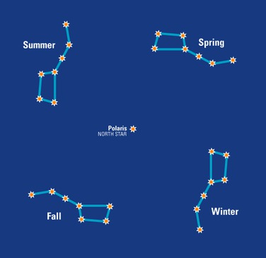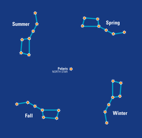 To locate the Big Dipper, face north and look for the seven bright stars that dominate the sky in this direction—they should be easy to find. Depending on the time of year, the pattern formed by these stars appears in a difference orientation, but the shape is always the same: